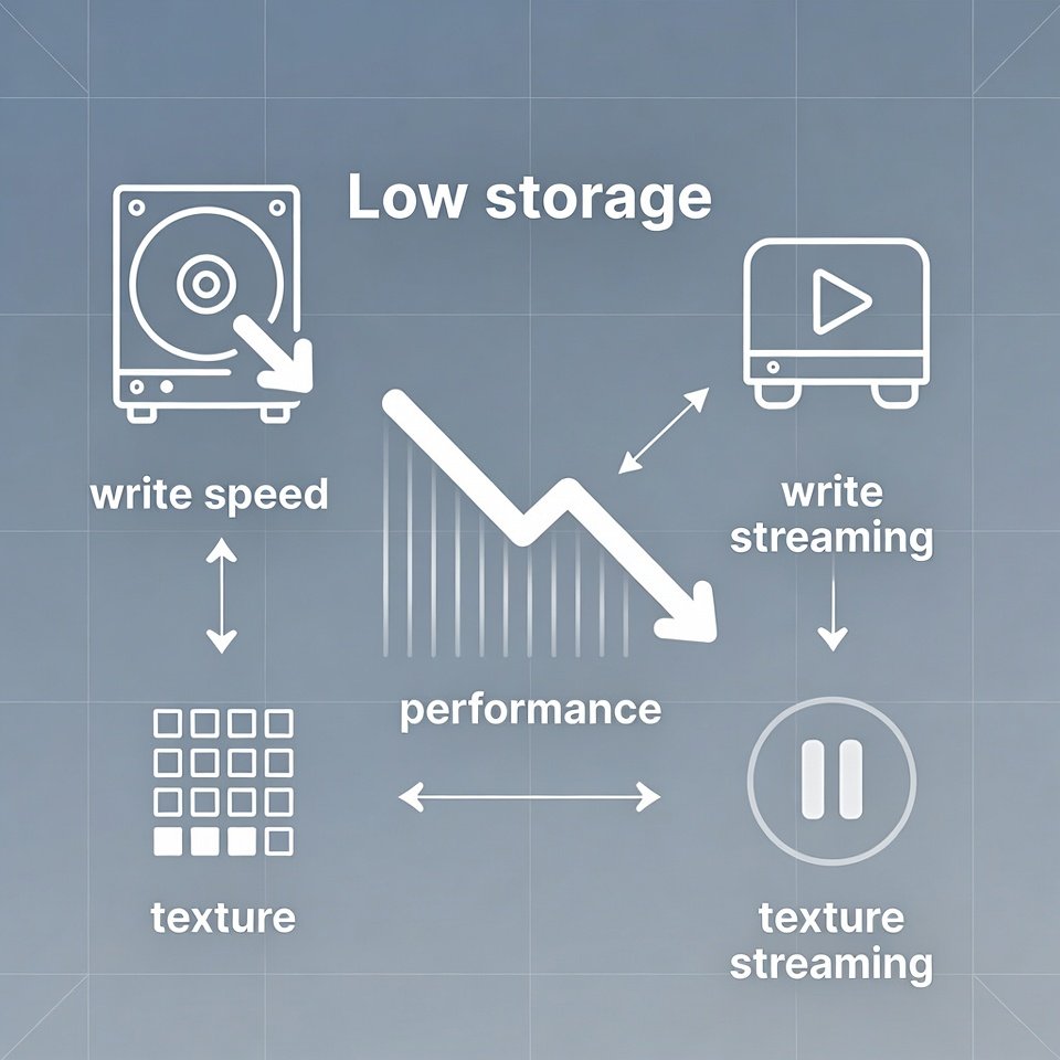 Low storage impacts write speed and texture streaming. Aim for at least five to ten gigabytes of free space. Delete unused media or old downloads. Adequate free space supports shader loading and prevents sudden pauses during high action scenes.