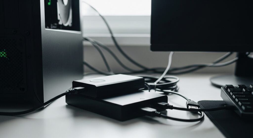 Shut down external drives, capture cards, and USB hubs next. Active data transfer during outages leads to file corruption. Streamers and content creators rely on such devices for recordings and backups. Removing power and cables preserves stored footage, save files, and configuration data.