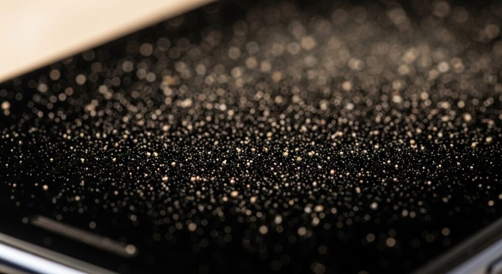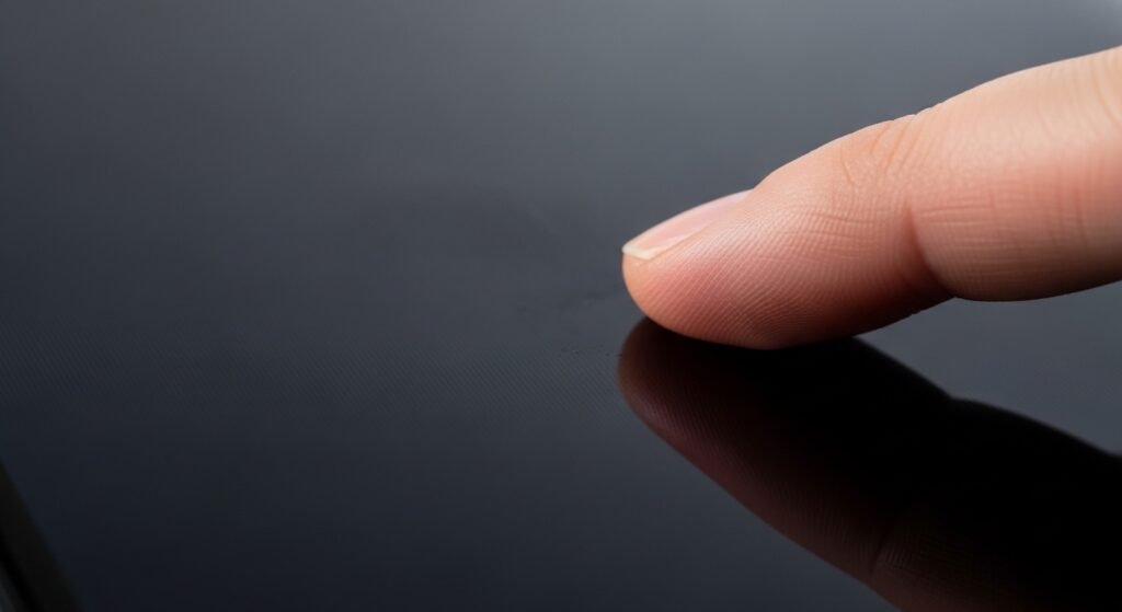 The nano-textured surface creates a surface effect which naturally protects against oil stains. Fingerprints become less visible due to the microscopic structure of glass which creates small peaks and valleys that stop skin oils from spreading into visible smudges. The glossy display maintains its clean appearance for longer periods compared to regular glossy screens.