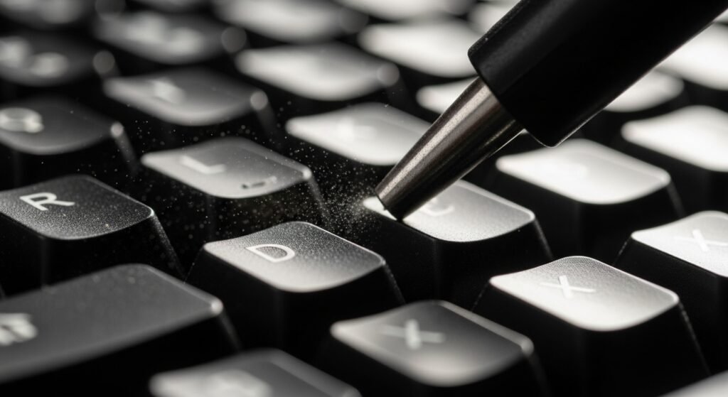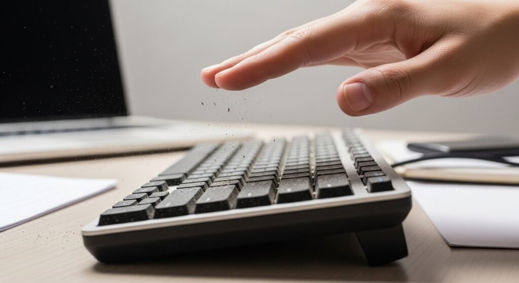 Dust, hair, and food particles block key travel. Mechanical and membrane keyboards both suffer from buildup. Turning the keyboard upside down and tapping lightly removes loose debris. Compressed air clears deeper particles. Gamers using WASD or spacebar face higher debris accumulation due to frequent use.